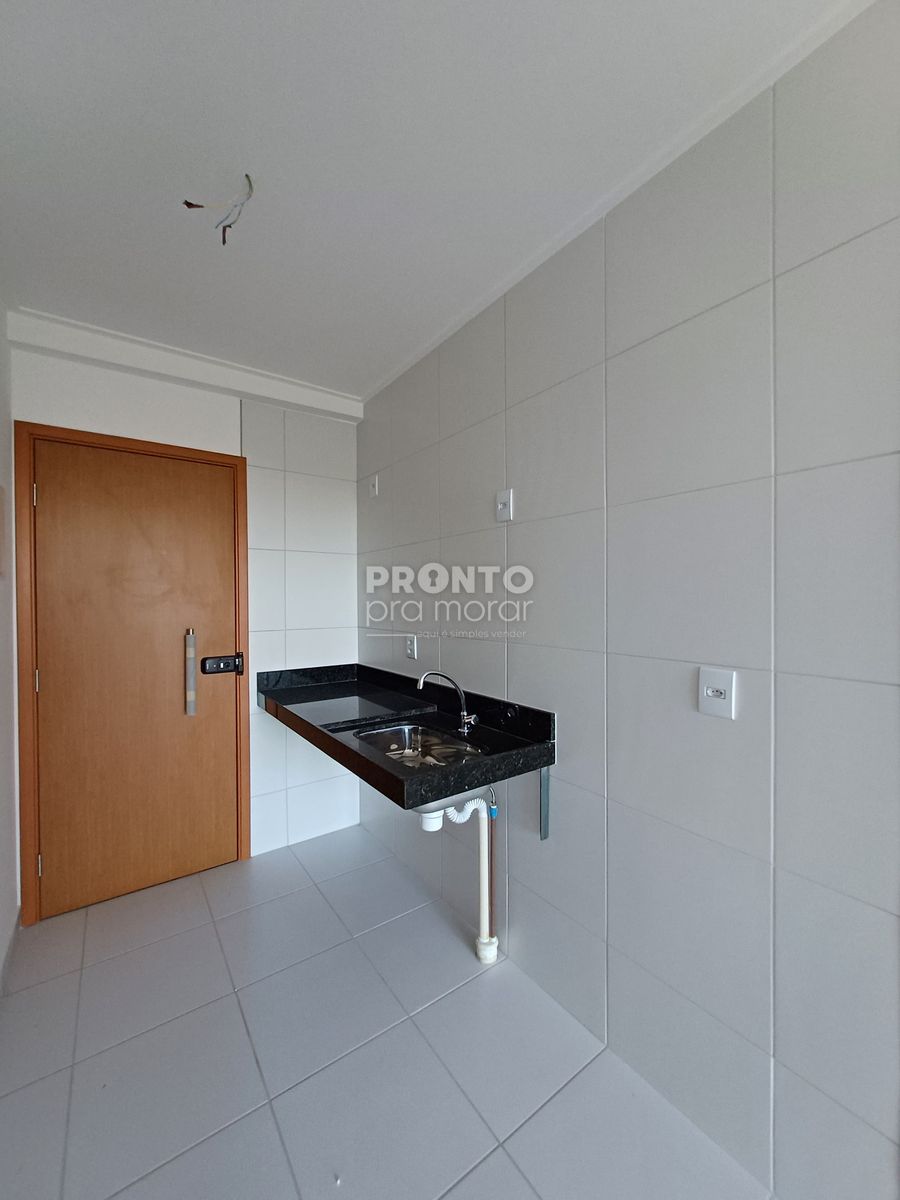 O imóvel possui varanda, sala/quarto, banheiro social, cozinha e uma vaga de garagem.