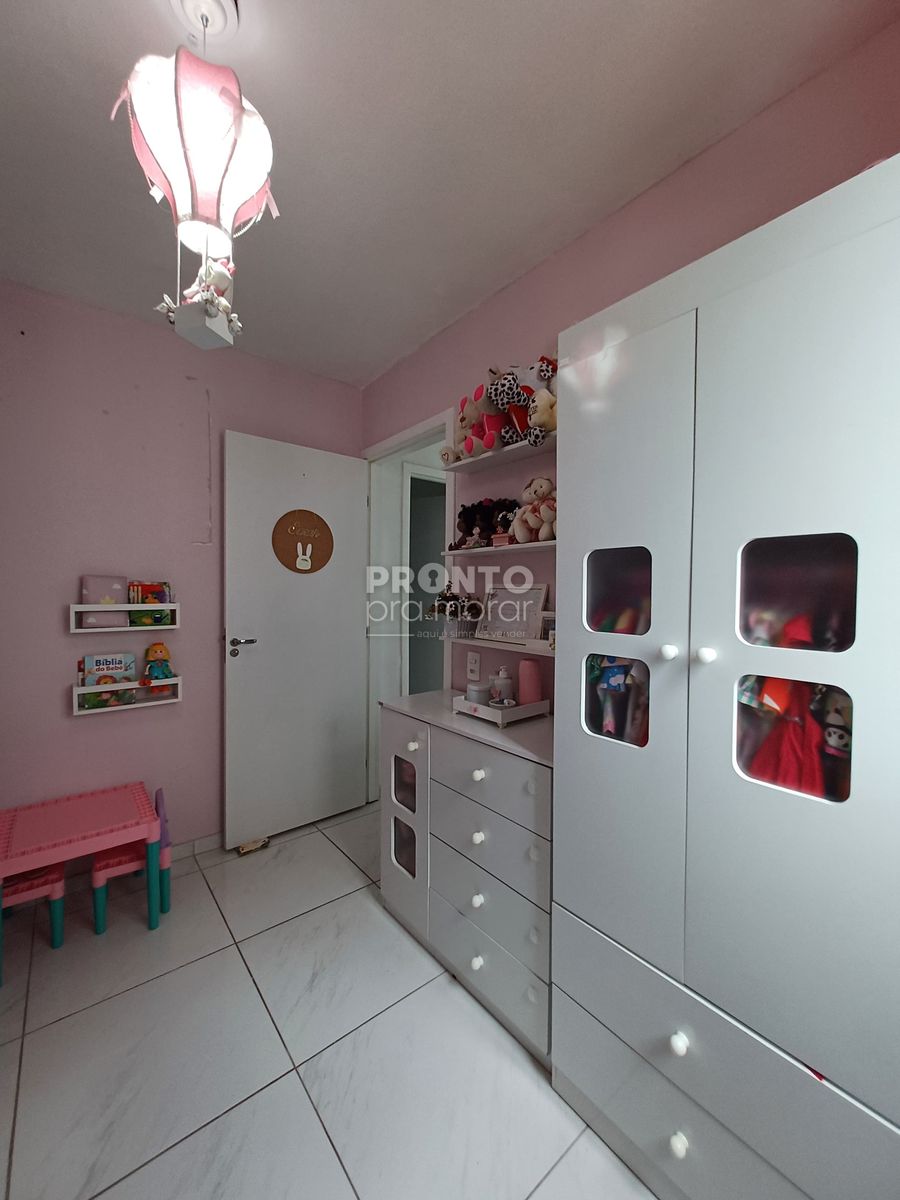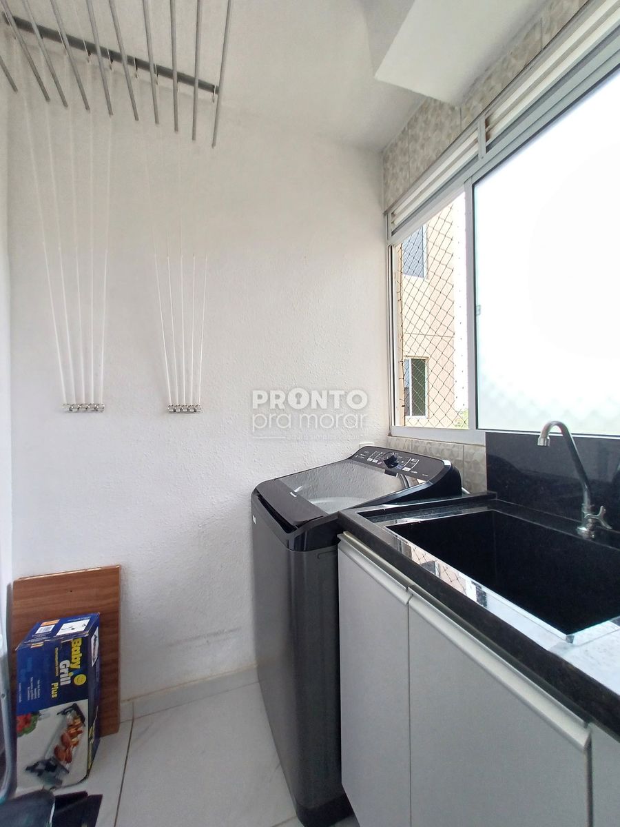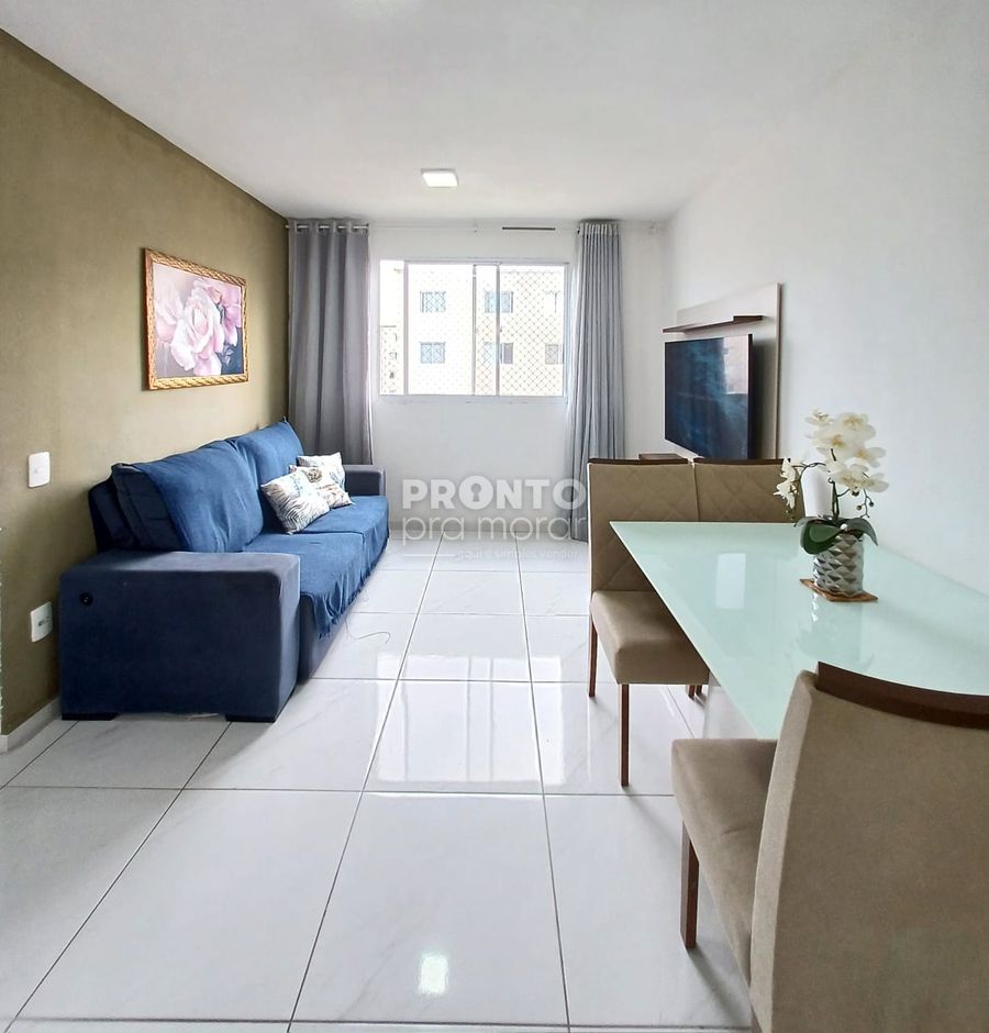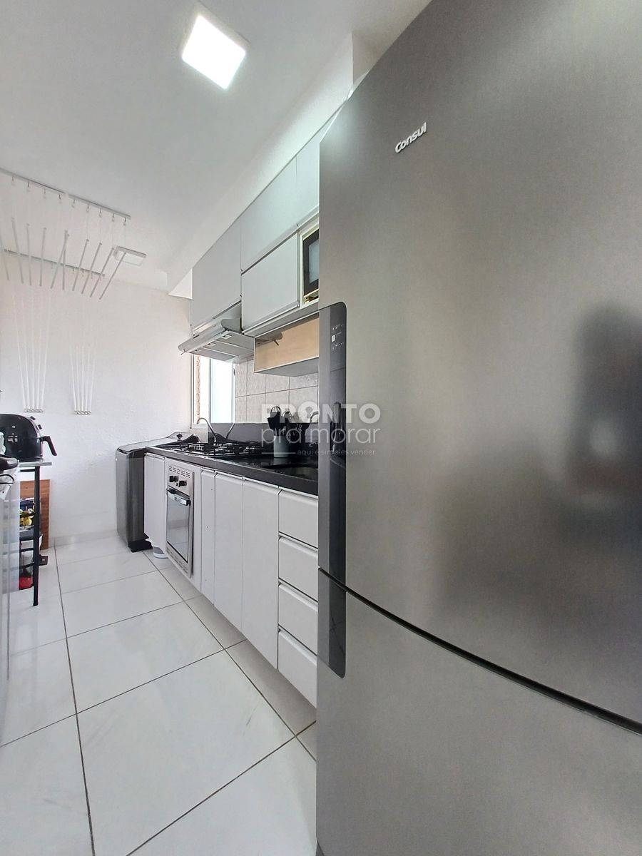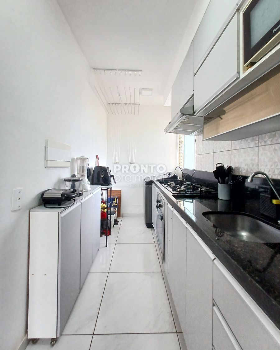 O imóvel possui sala para dois ambientes, dois quantos, banheiro social, cozinha, área de serviço e uma vaga de garagem.