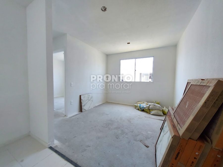 O imóvel possui sala, dois quartos, banheiro social, cozinha, área de serviço e uma vaga de garagem.