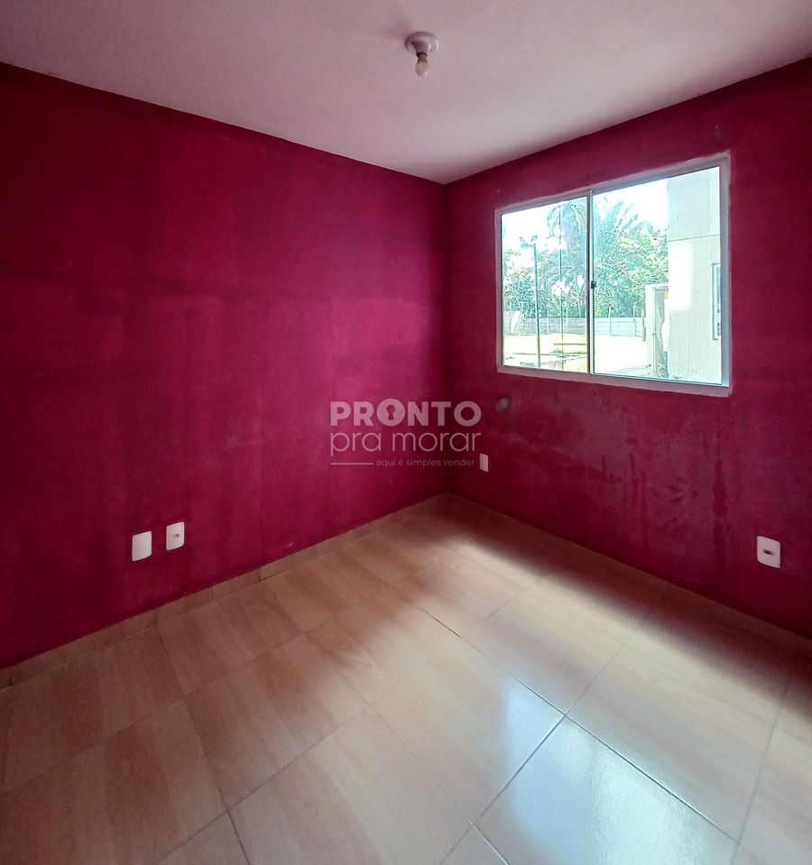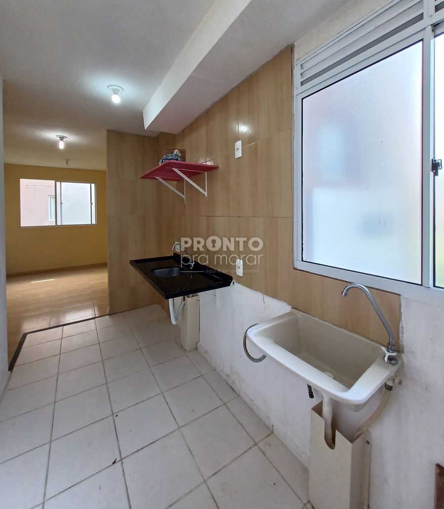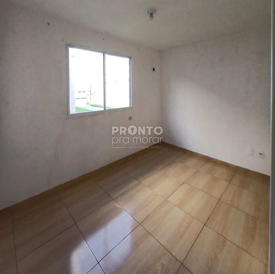 O imóvel possui sala para dois ambientes, dois quartos, banheiro social, cozinha, área de serviço e uma vaga de garagem.