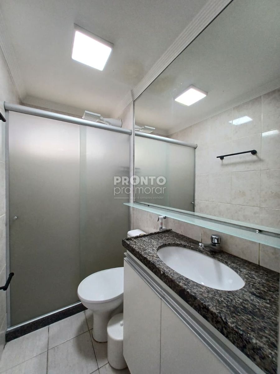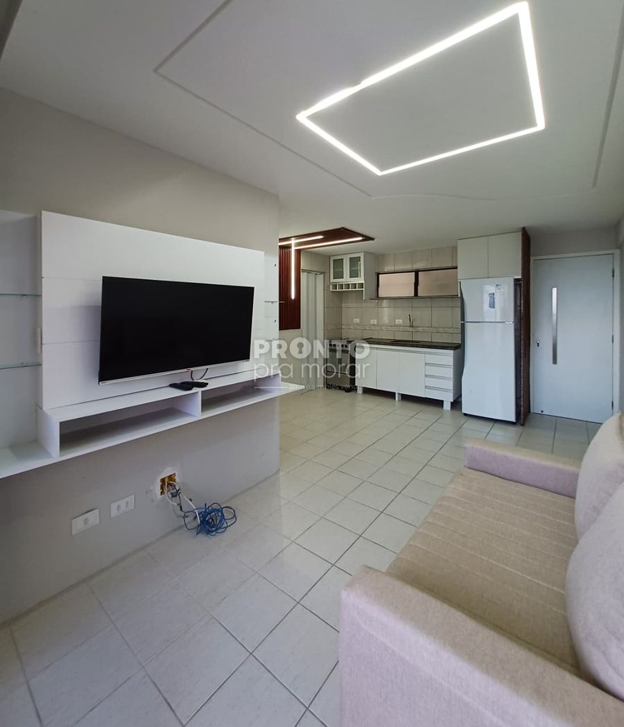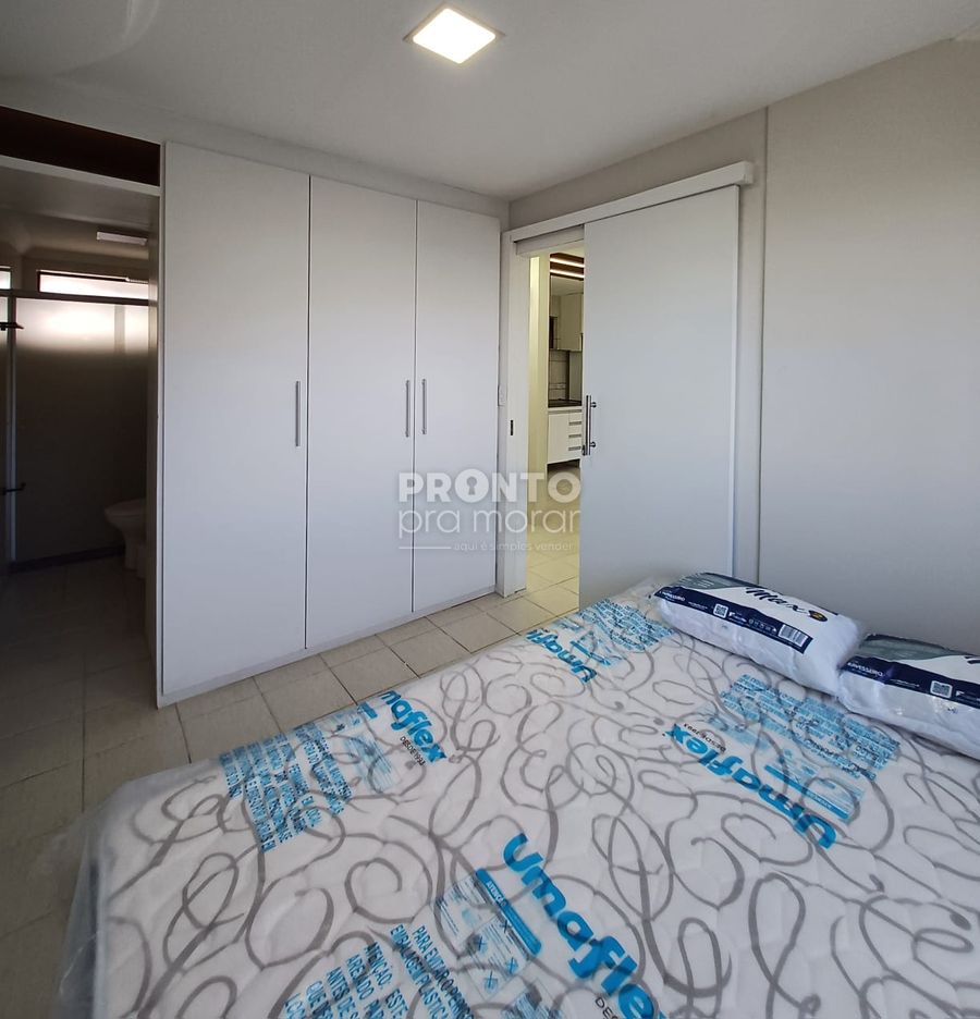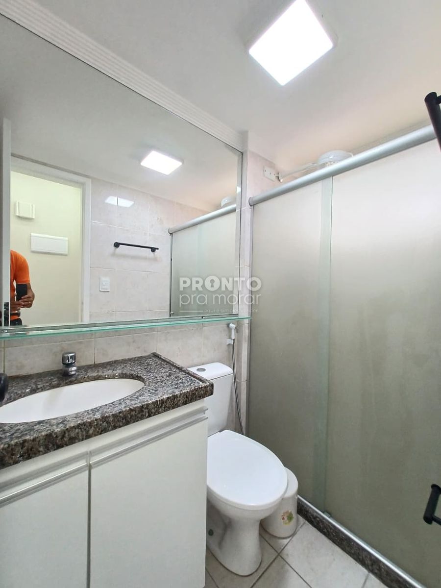 O apartamento tem 49m² de área construída. dispõe de varanda, sala para dois ambientes, dois quartos sendo um suíte, um banheiro social, área de serviço e uma vaga de garagem.