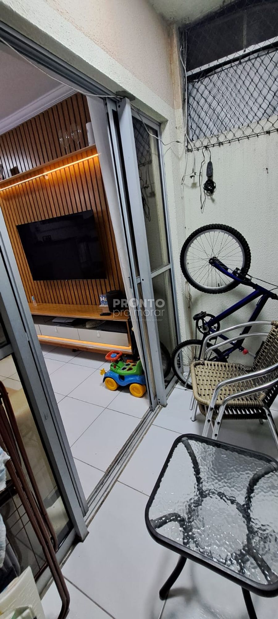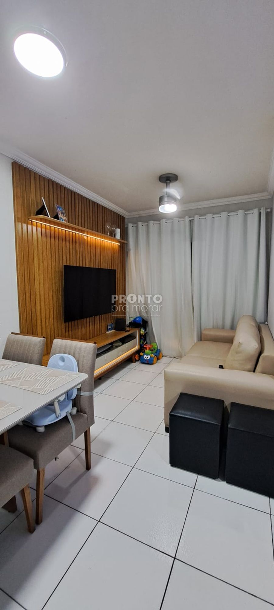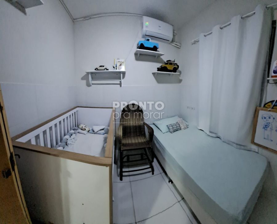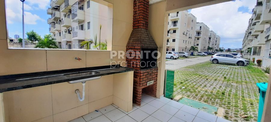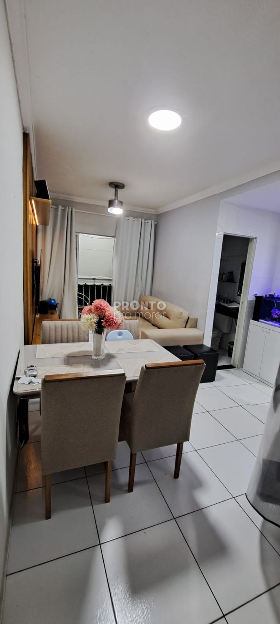 O imóvel possui varanda, sala para dois ambientes, dois quartos, banheiro social, cozinha, área de serviço e uma vaga de garagem.