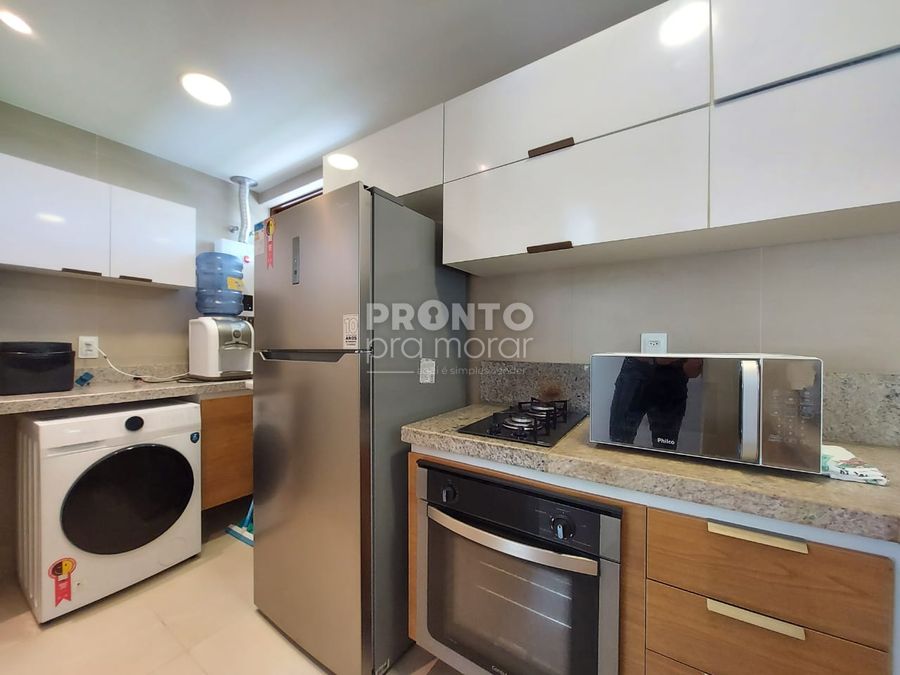 O imóvel é mobiliado, possui sala para dois ambientes, dois quartos sendo um suíte, cozinha, área de serviço e uma vaga de garagem.