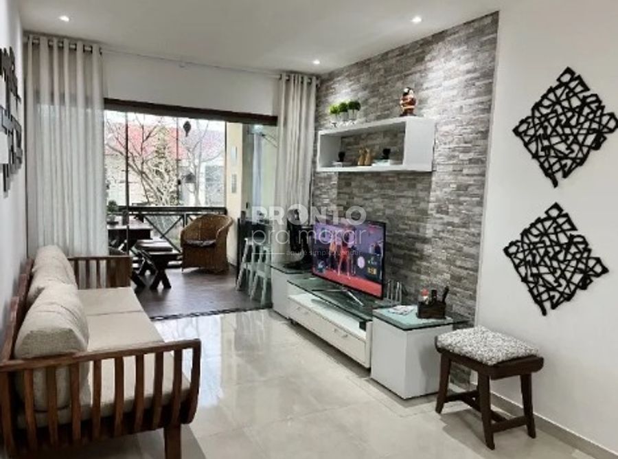 O imóvel possui varanda, sala para dois ambientes, dois quartos sendo um suíte, banheiro social, cozinha, área de serviço e uma vaga de garagem.