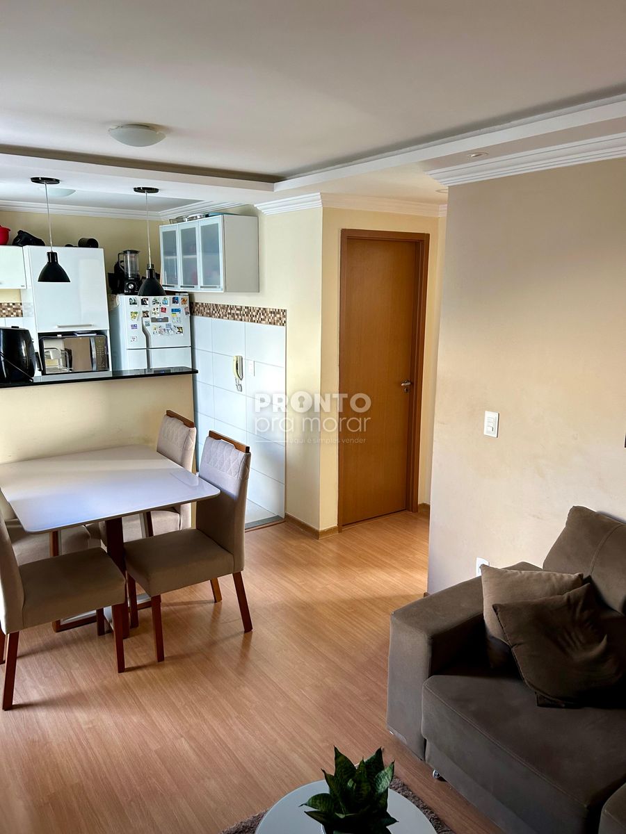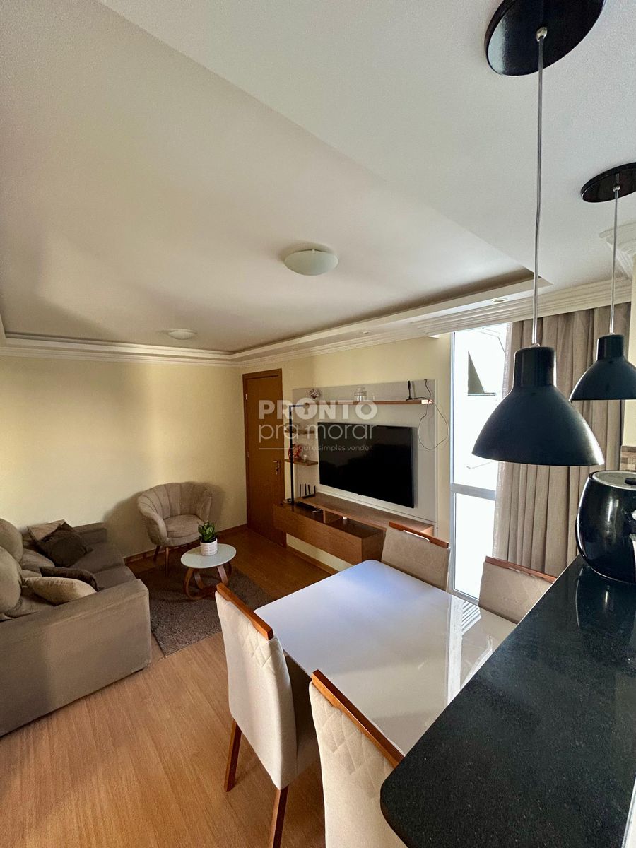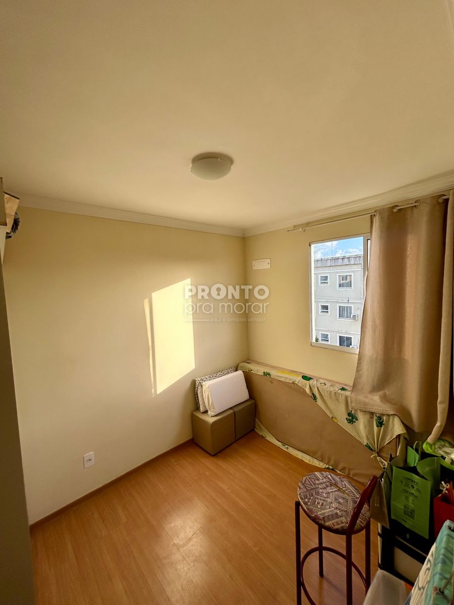 O imóvel possui sala para dois ambientes, dois quartos, banheiro social, cozinha, área de serviço e uma vaga de garagem.