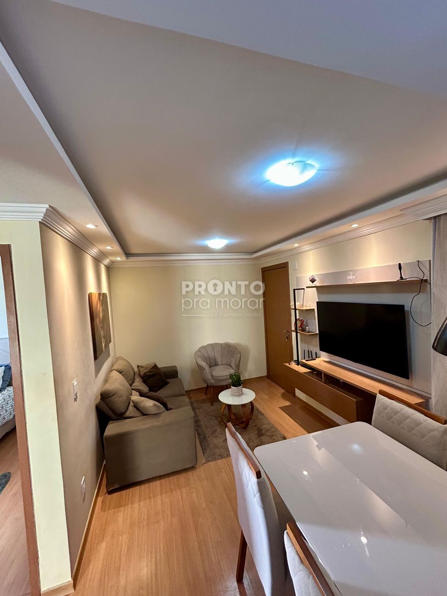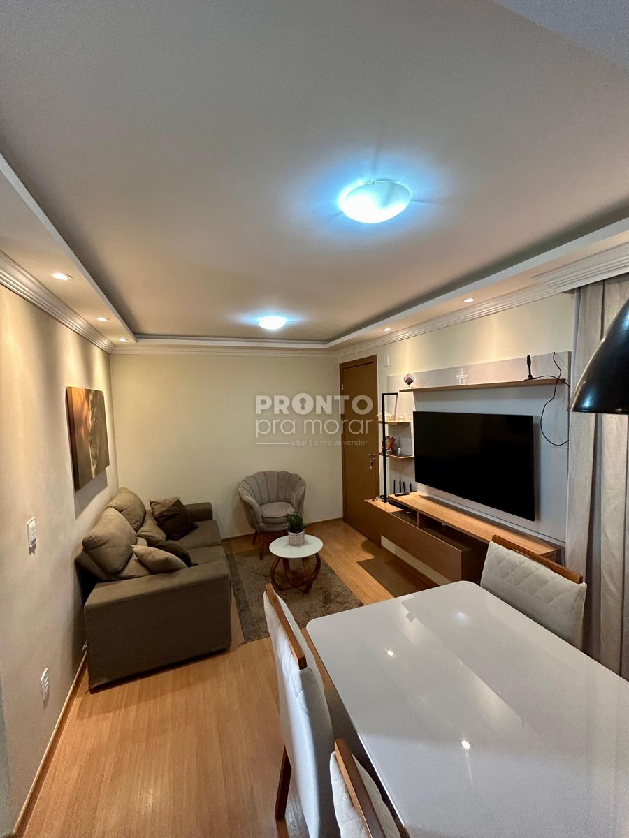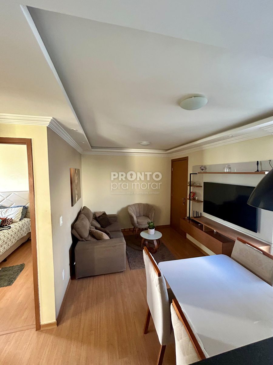 O imóvel possui sala para dois ambientes, dois quartos, banheiro social, cozinha, área de serviço e uma vaga de garagem.
