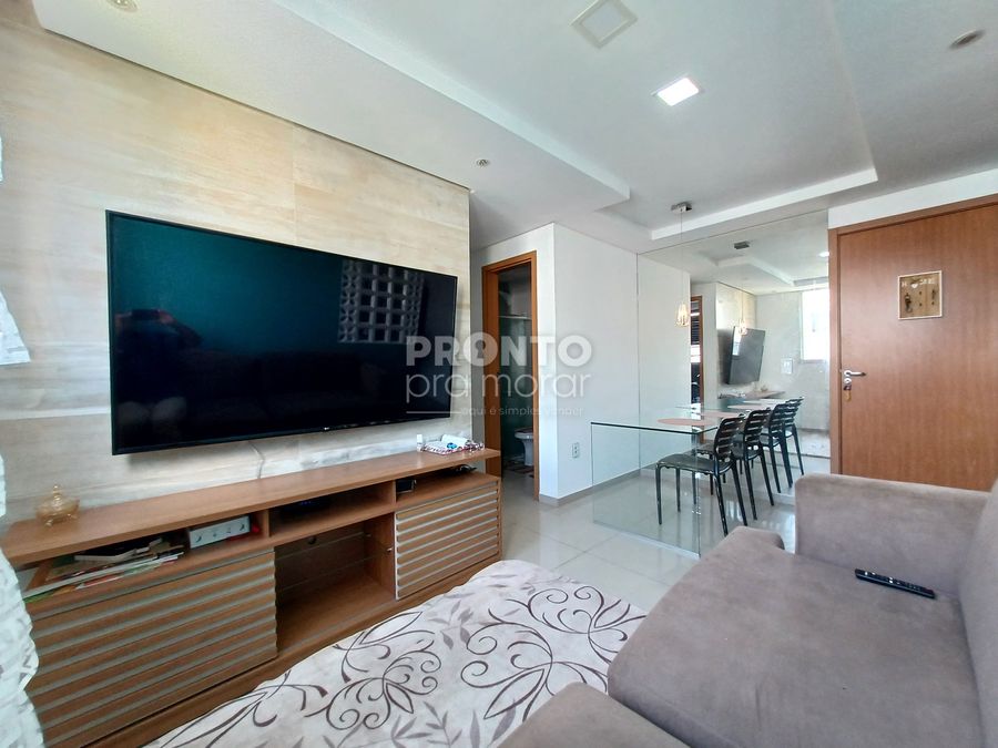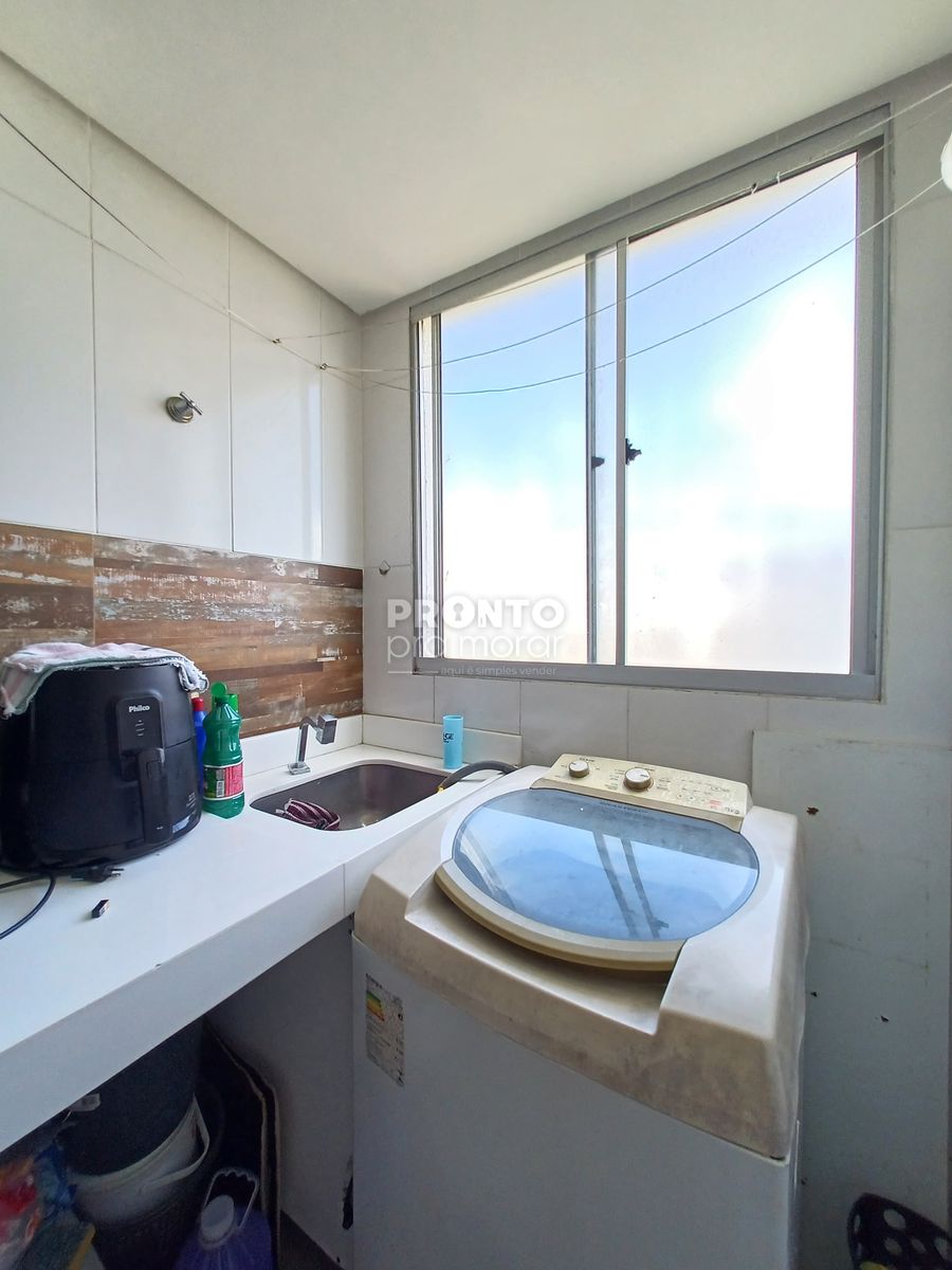 O imovel possui sala para dois ambientes, dois quartos, banheiro social, cozinha, área de serviço e uma vaga de garagem.
