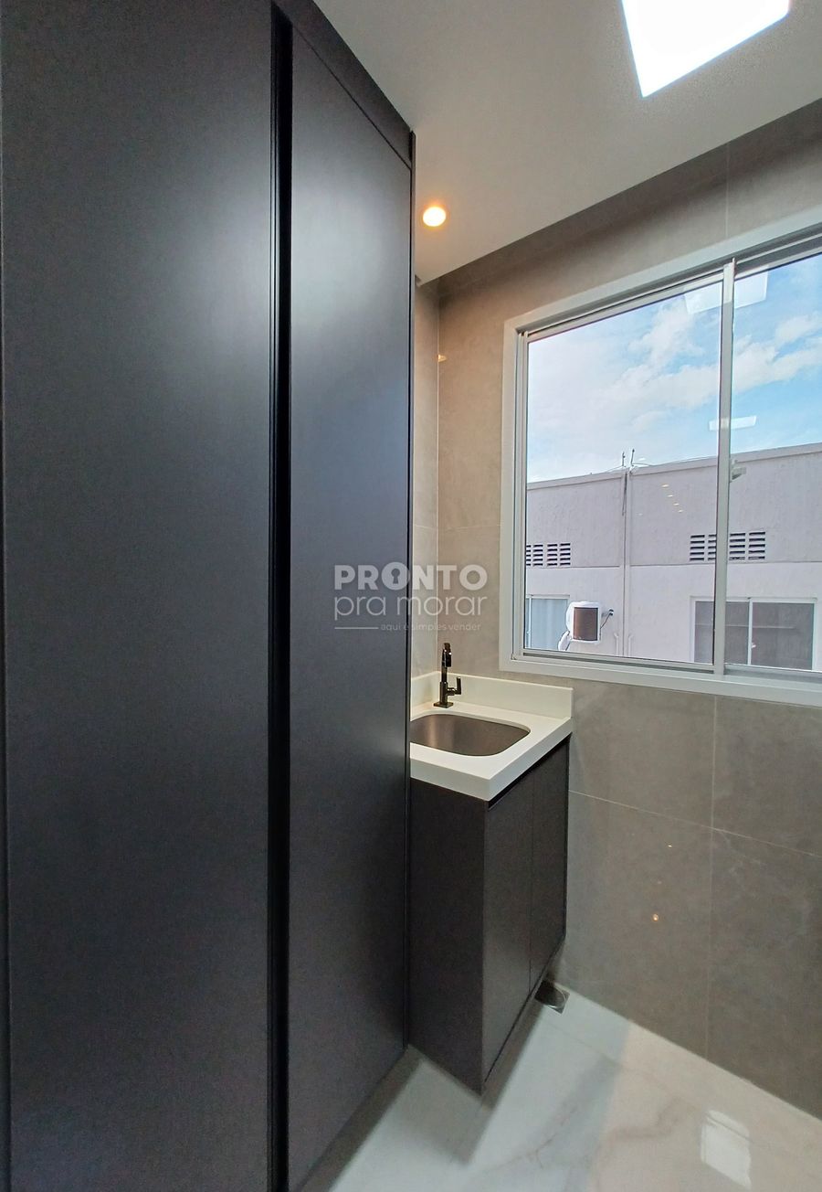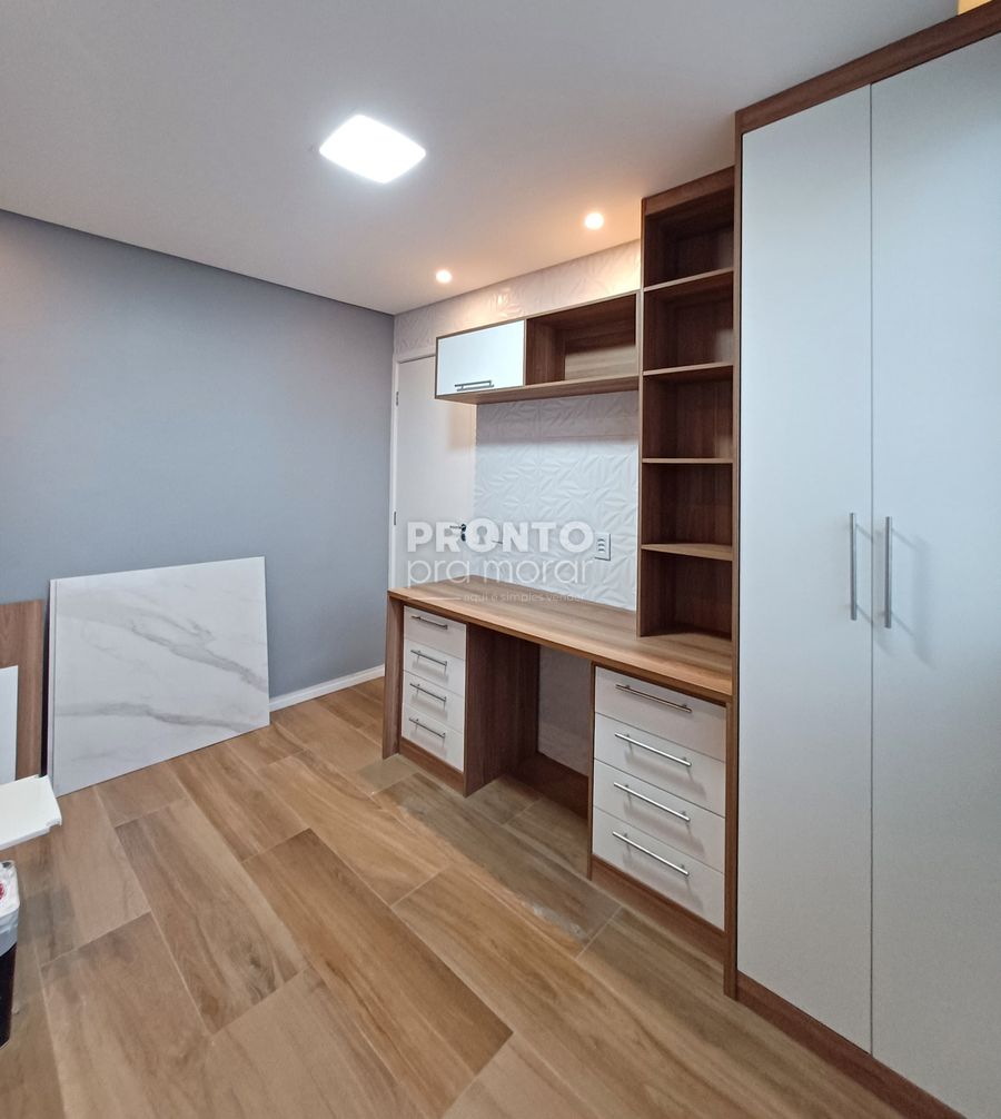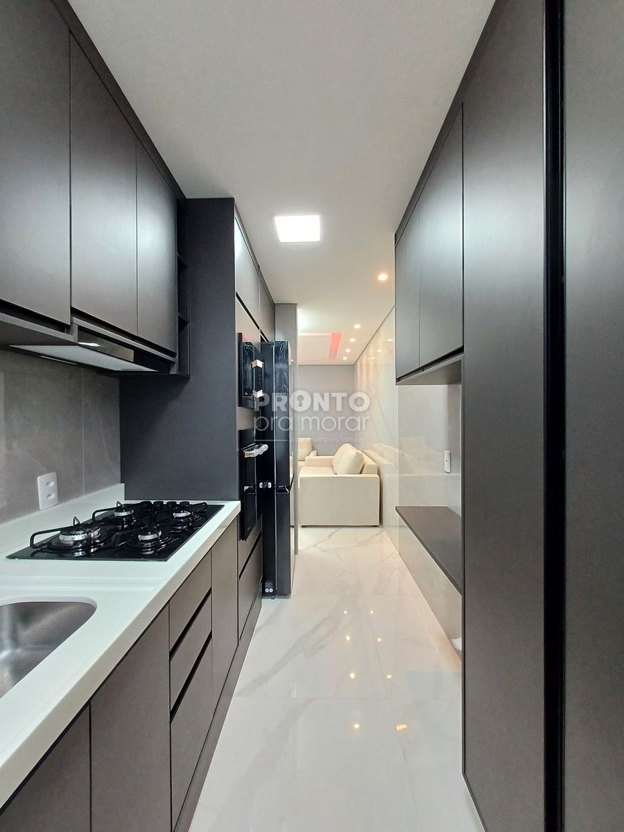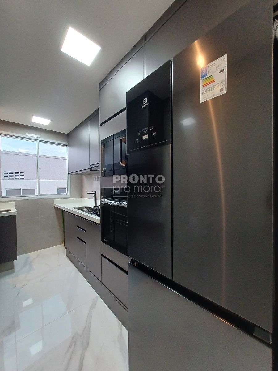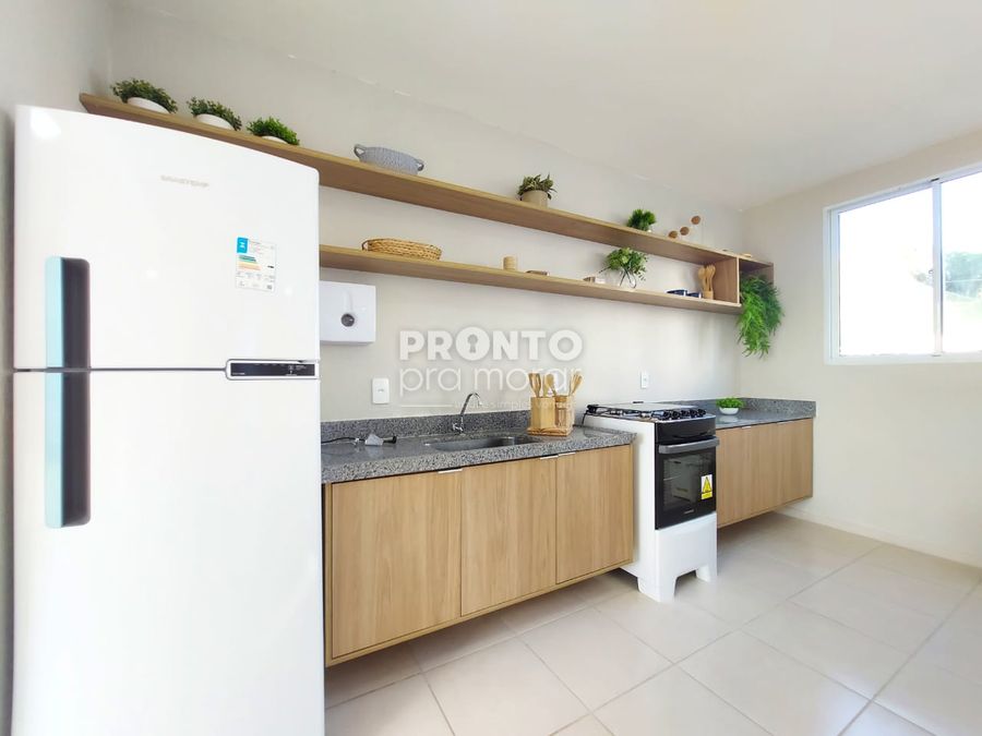 O imóvel possui sala para dois ambientes, dois quartos com armários grandes, banheiro social, cozinha com móveis fixos, área de serviço e uma vaga de garagem.