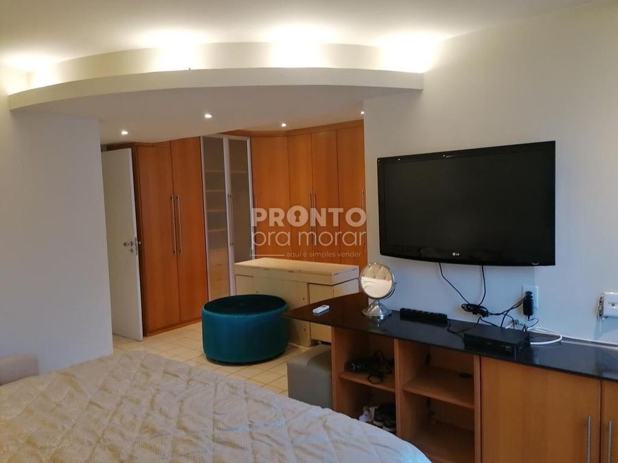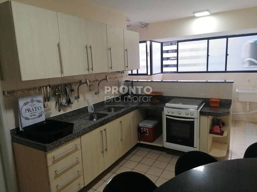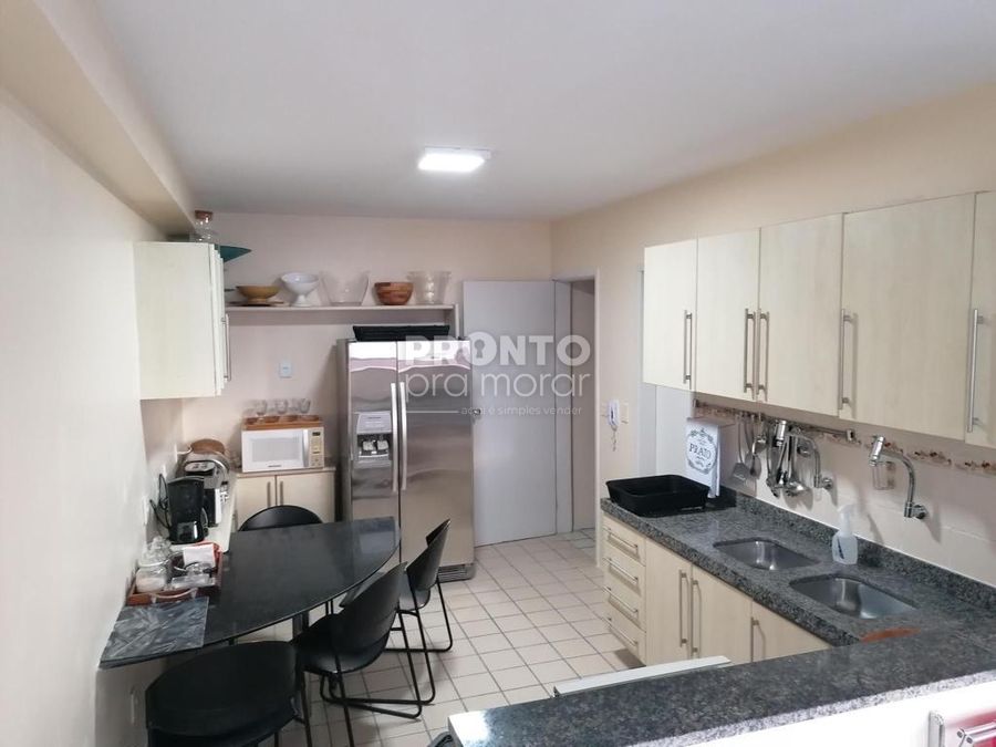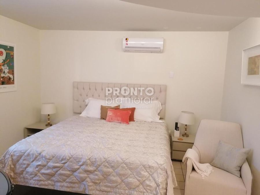 O imóvel possui varanda ampla, sala sofisticada para três ambientes com ar condicionado, três quartos com ar condicionado e camas king size sendo duas suítes, banheiro social, cozinha ampla e equipada com armários planejados, área de serviço, quarto e banheiro de serviço e duas vagas de garagem.