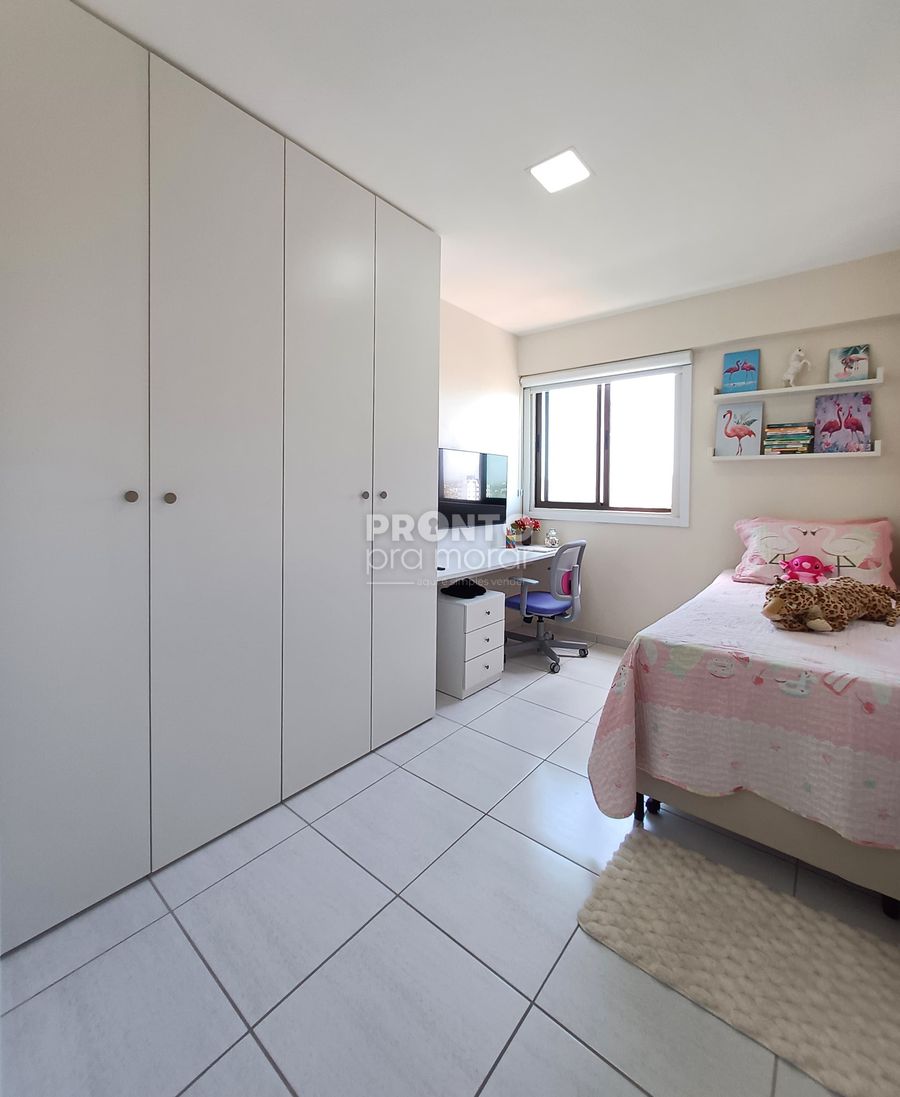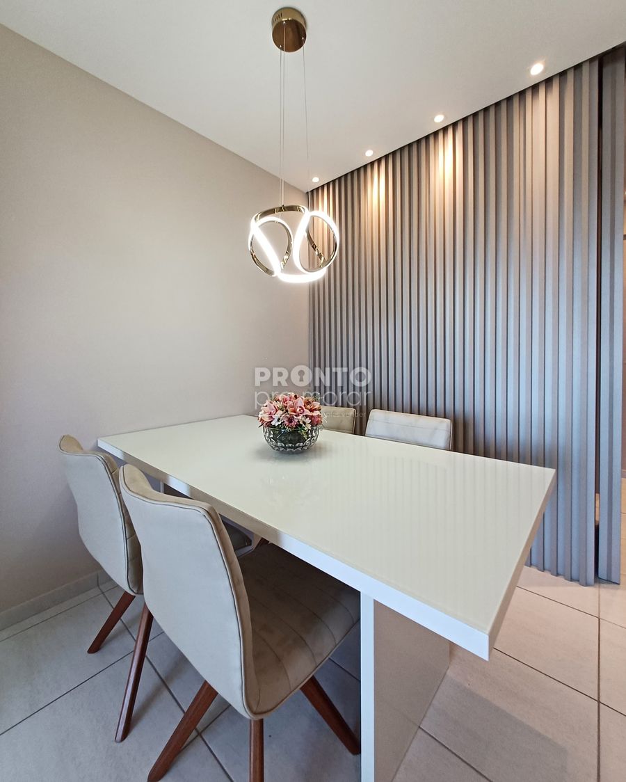 O imóvel possui varanda, sala para dois ambientes, três quartos sendo uma suíte, banheiro social, cozinha, área de serviço e uma vaga de garagem.
