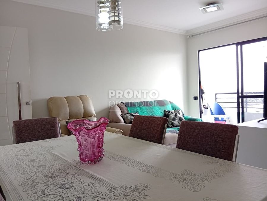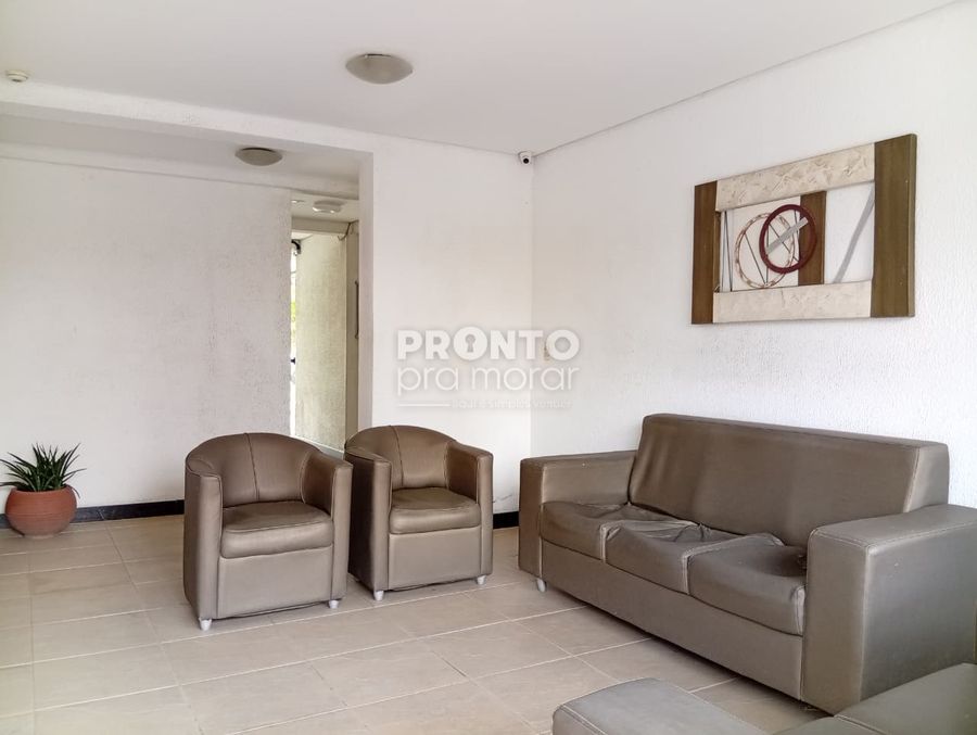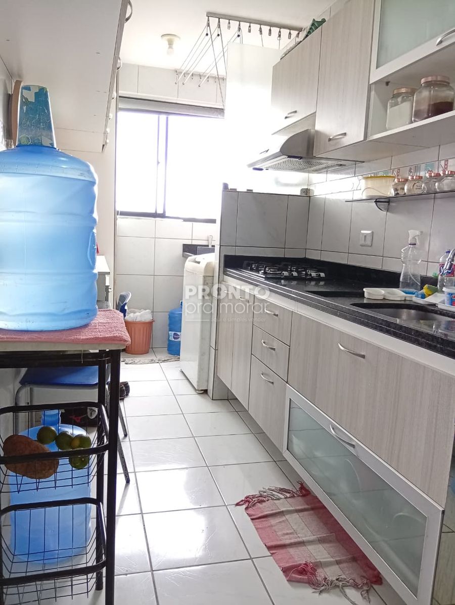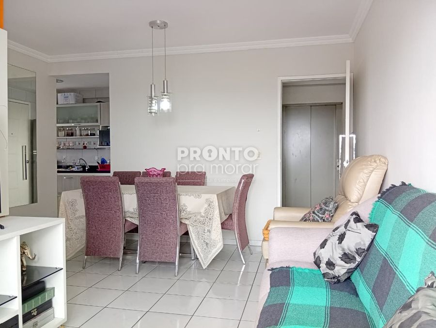 O apartamento possui sala para dois ambientes, três quartos sendo um suíte, uma cozinha ampla, um banheiro social, uma área de serviço e uma vaga de garagem.