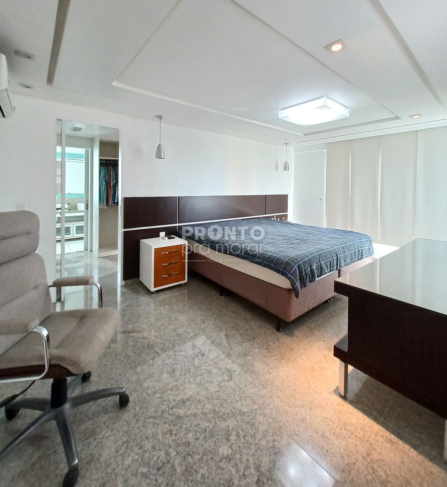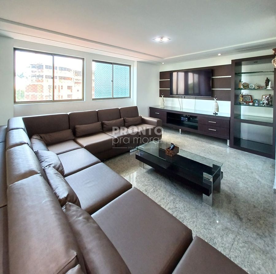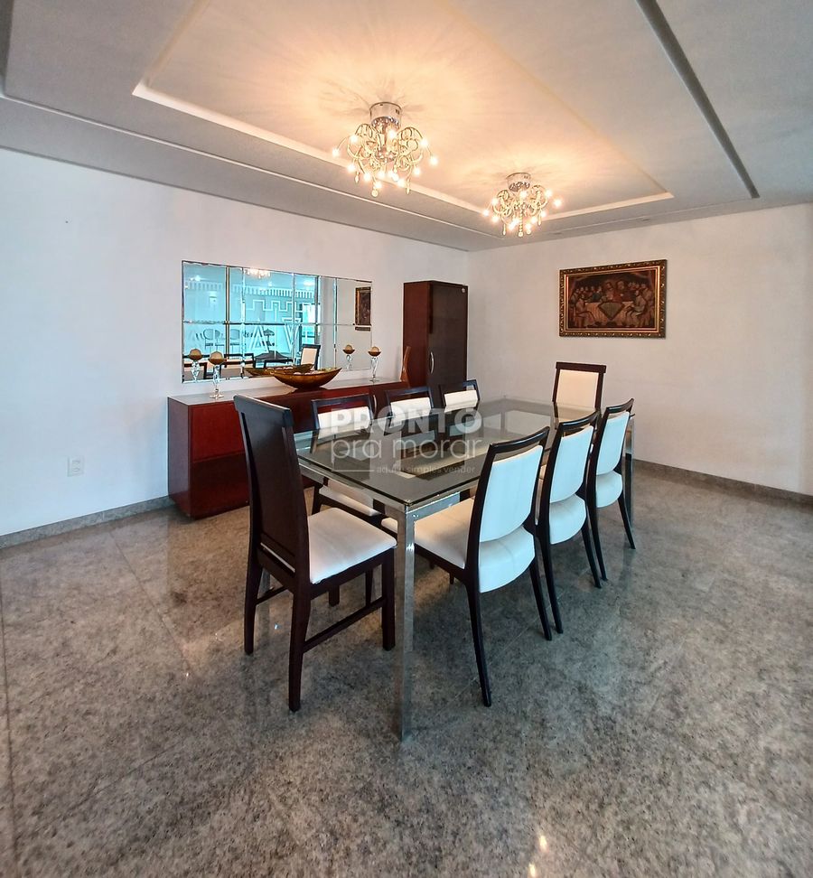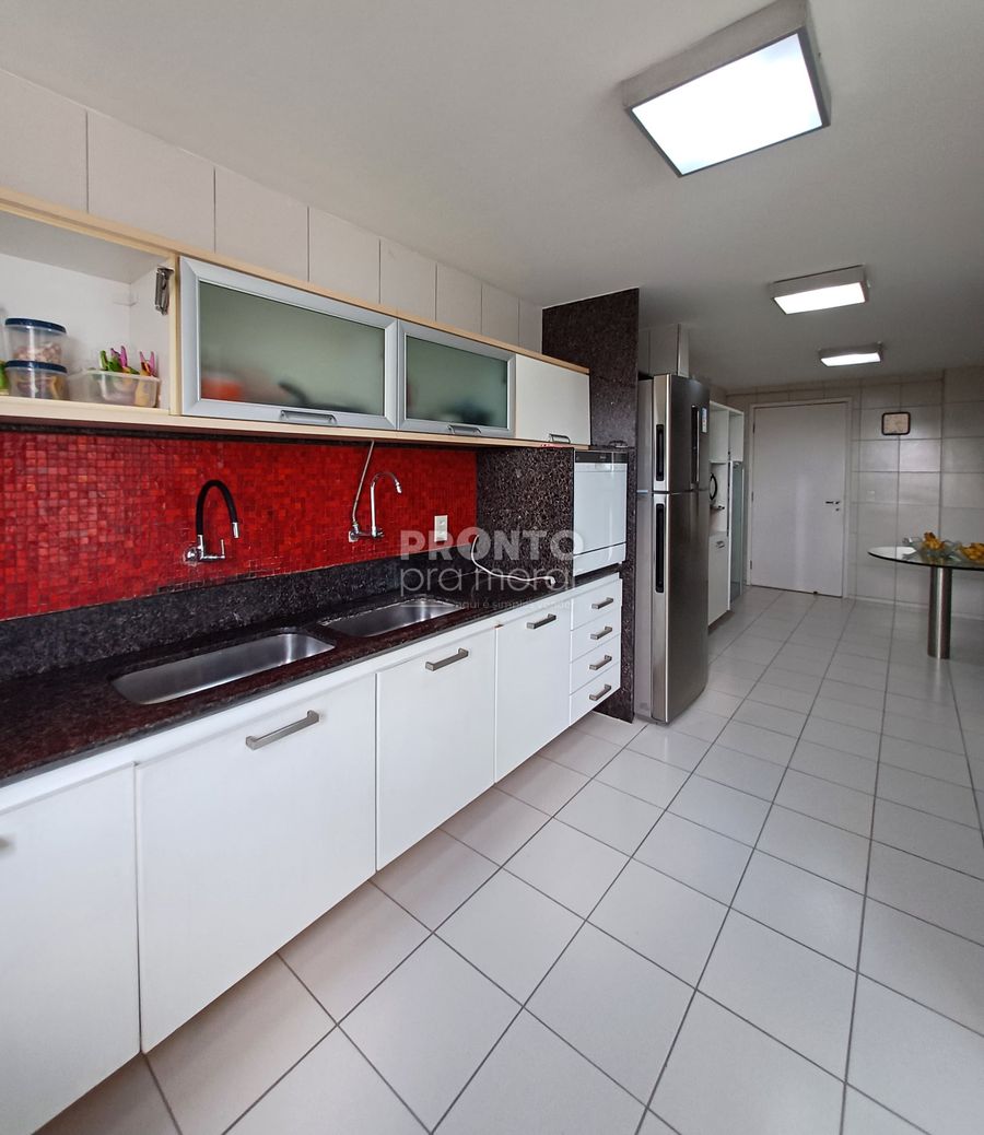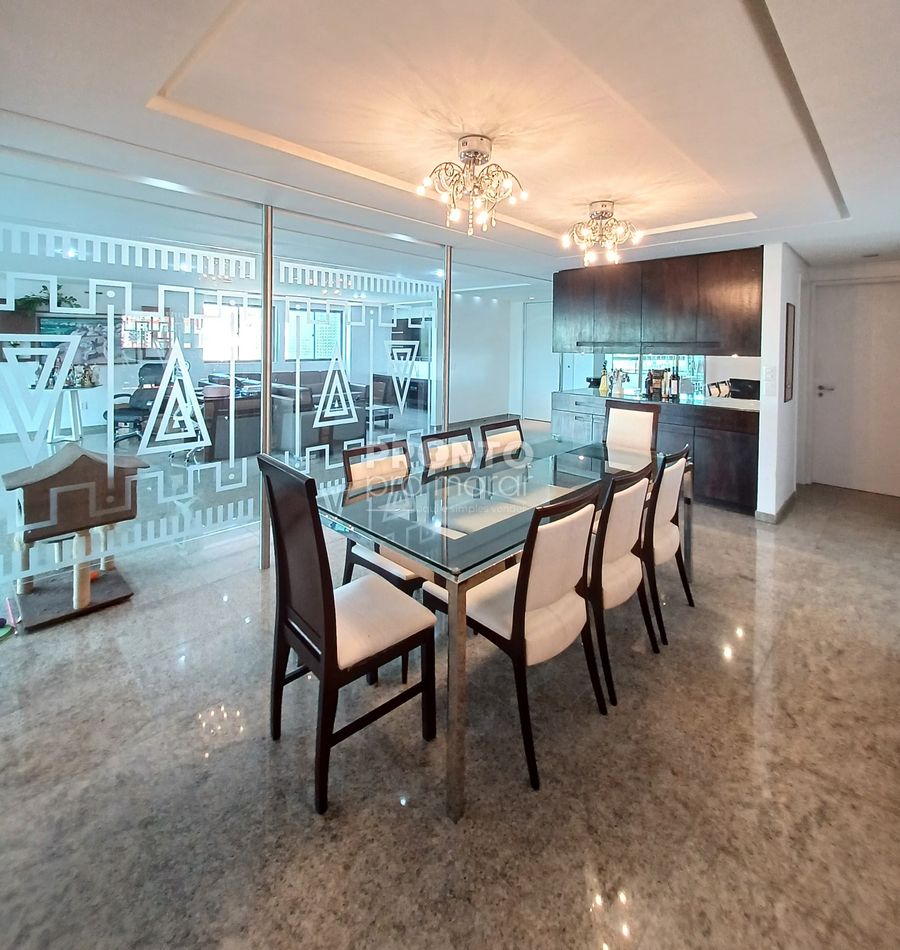O apartamento conta varanda, sala para três ambientes, quatro suítes, uma delas com closet, lavabo, cozinha, área de serviço, quarto e WC de serviço, além de 4 vagas de garagem.