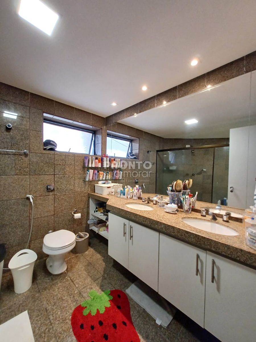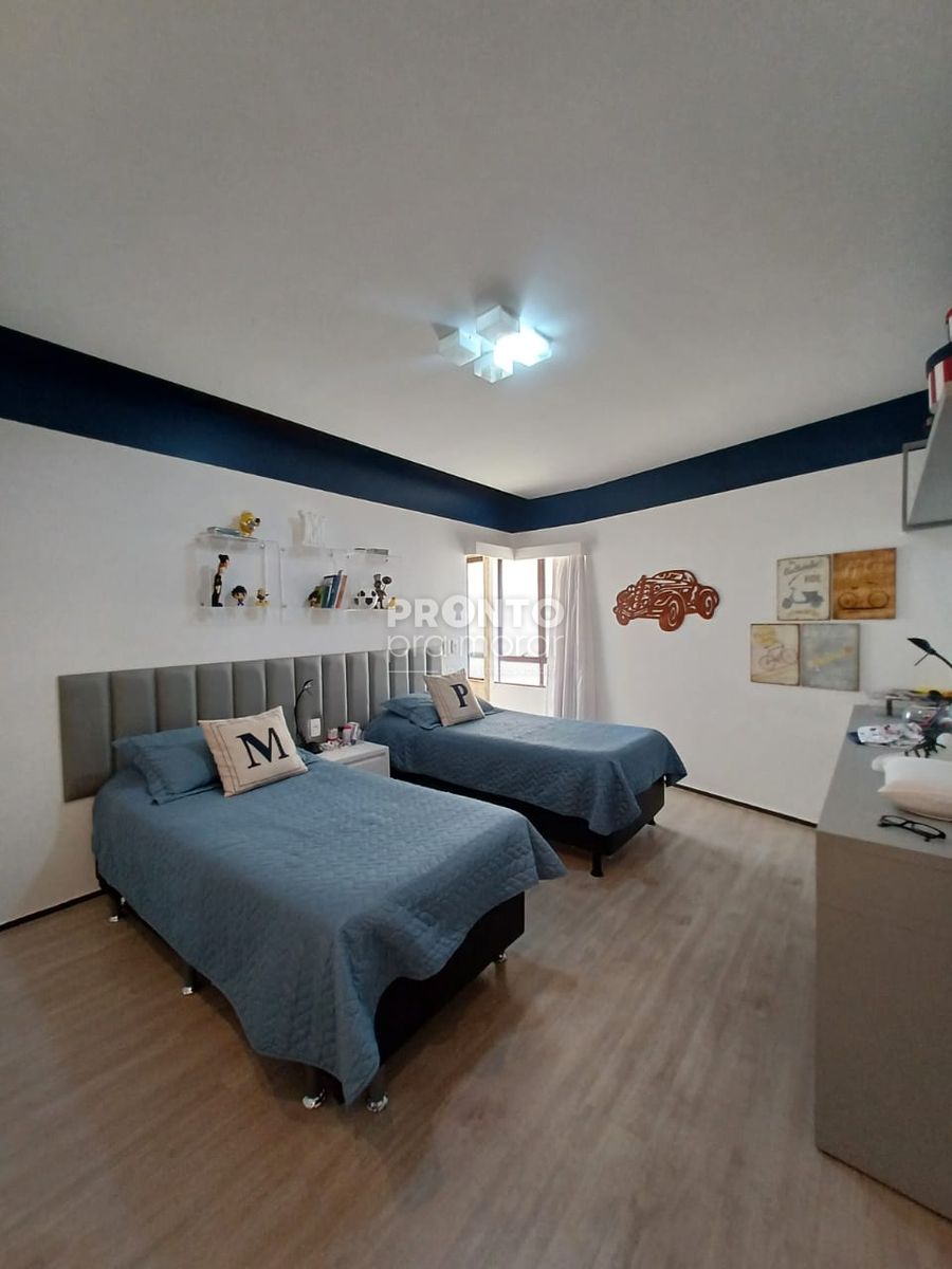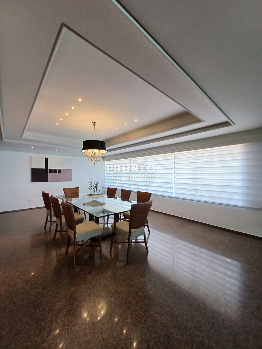 O imóvel conta com varanda, ampla sala para três ambientes, banheiro social, cinco quartos (sendo quatro suítes), cozinha funcional, área de serviço, banheiro e dormitório de serviço, além de quatro vagas de garagem.