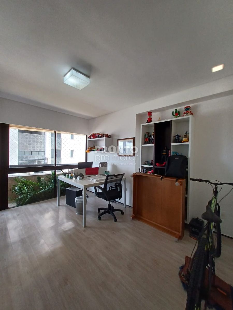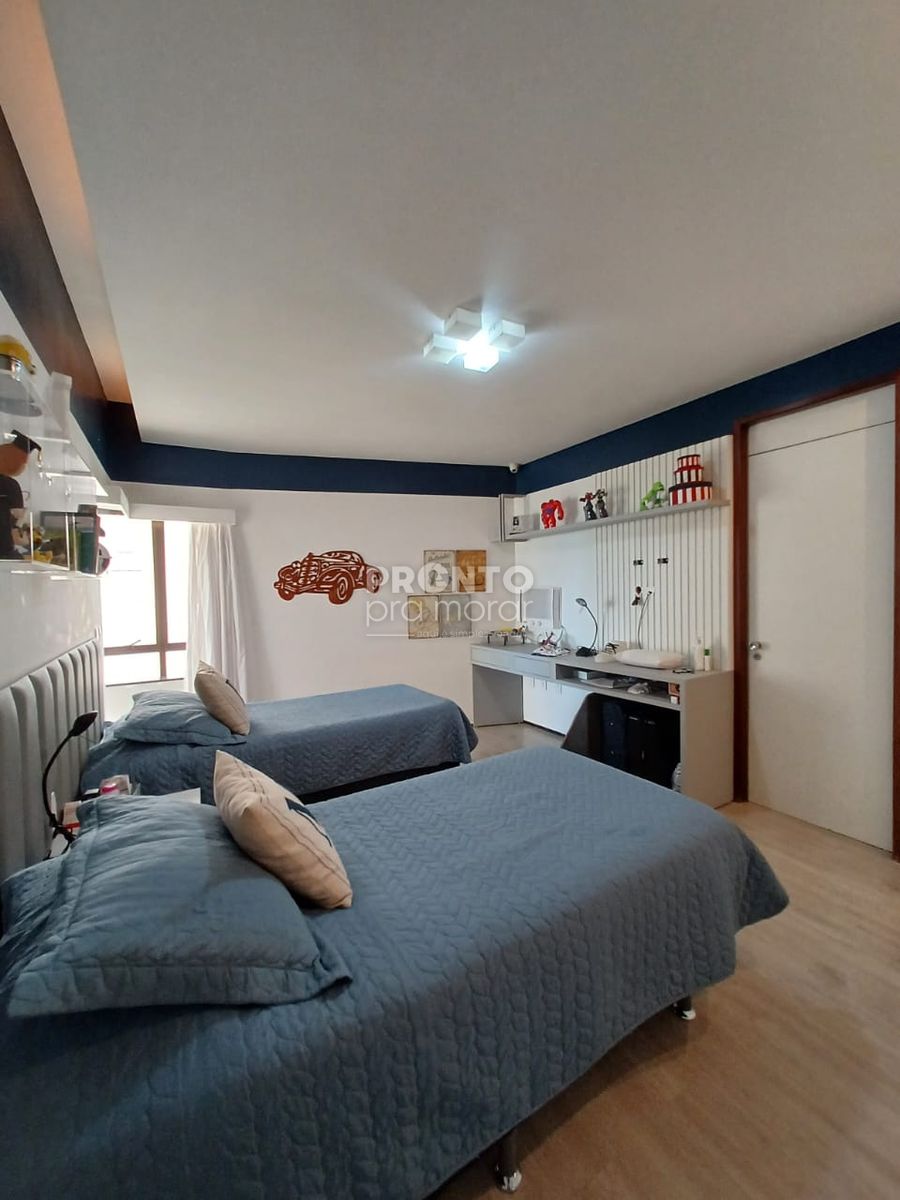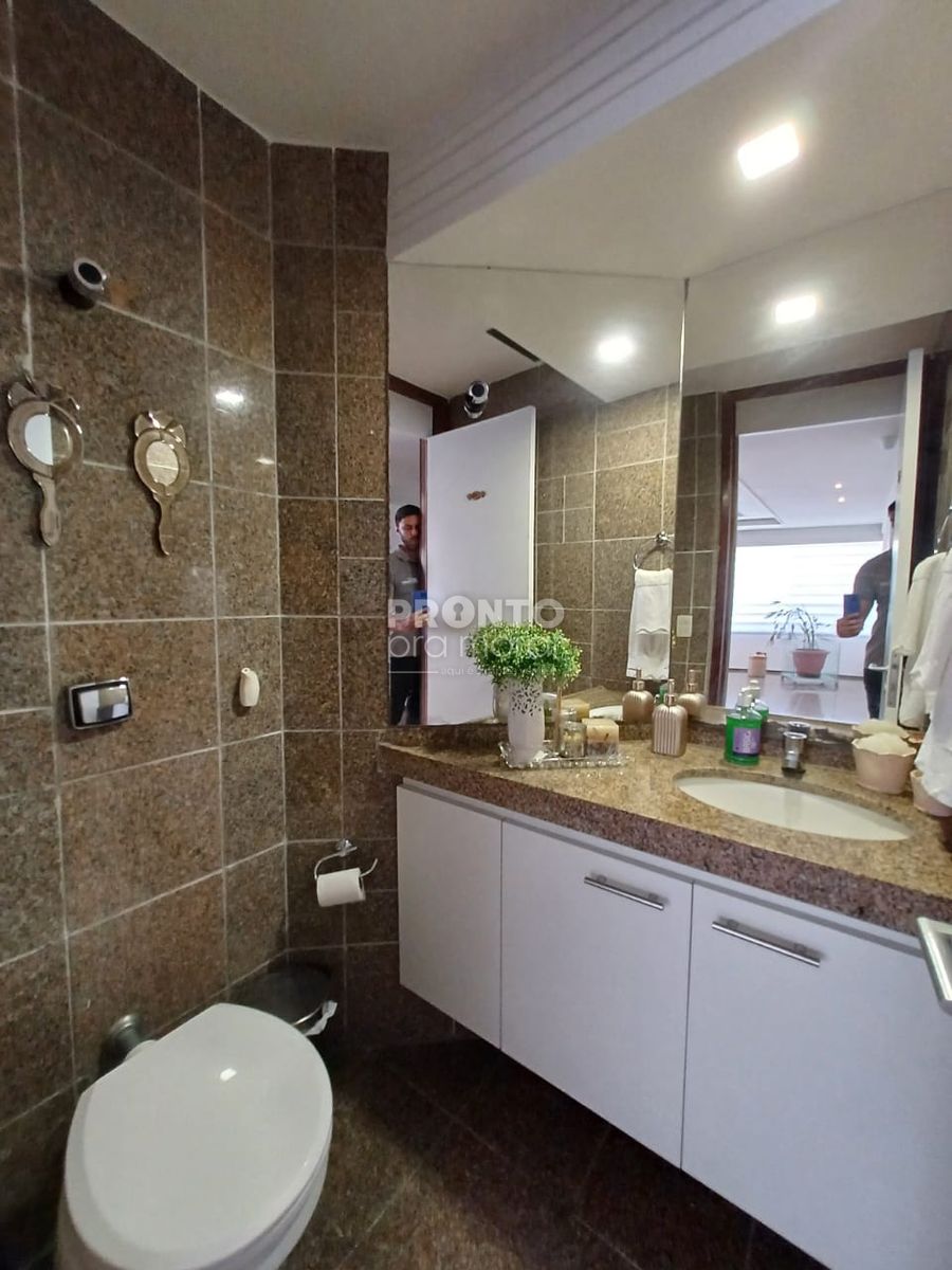 O imóvel conta com varanda, ampla sala para três ambientes, banheiro social, cinco quartos (sendo quatro suítes), cozinha funcional, área de serviço, banheiro e dormitório de serviço, além de quatro vagas de garagem.