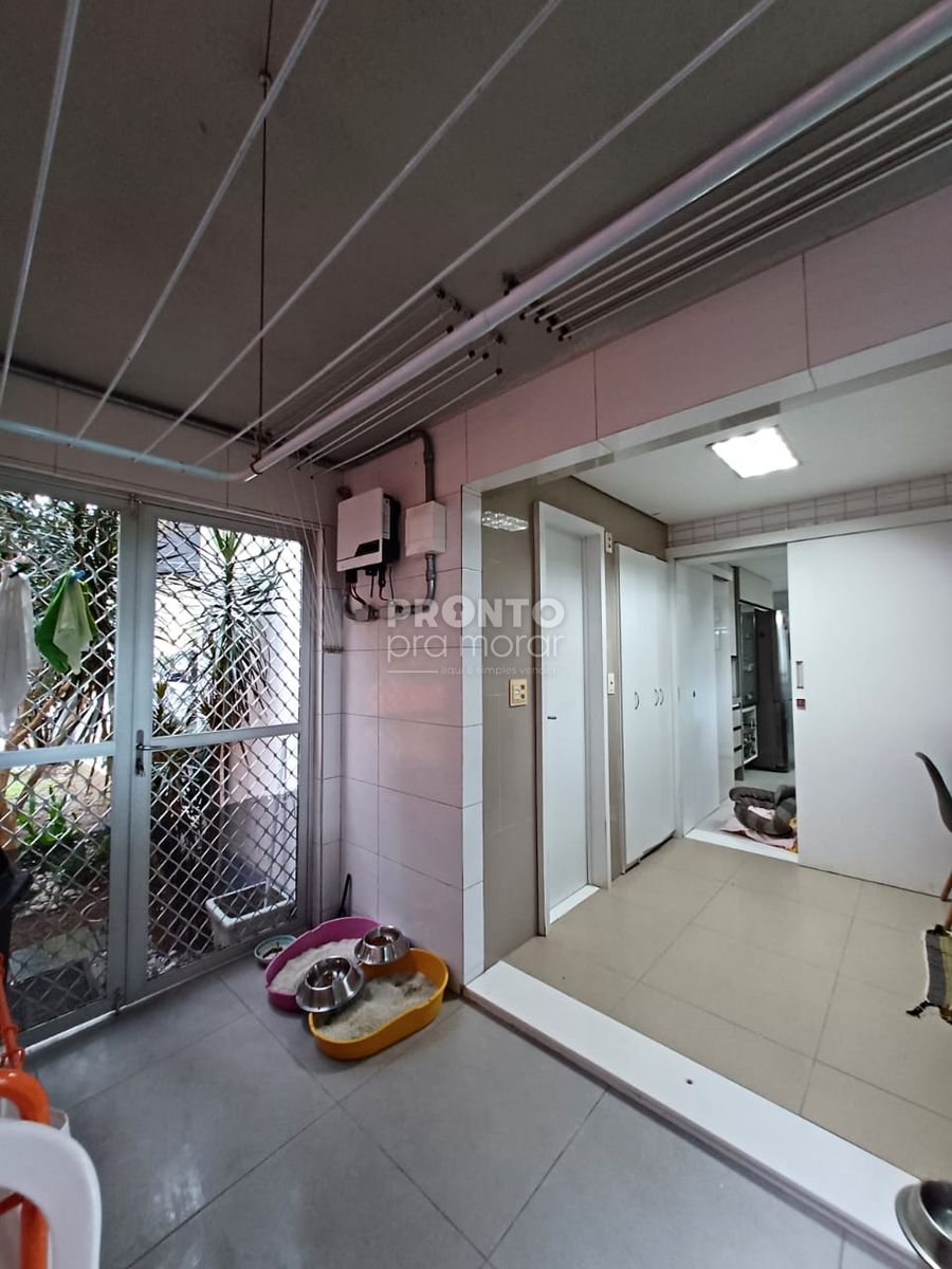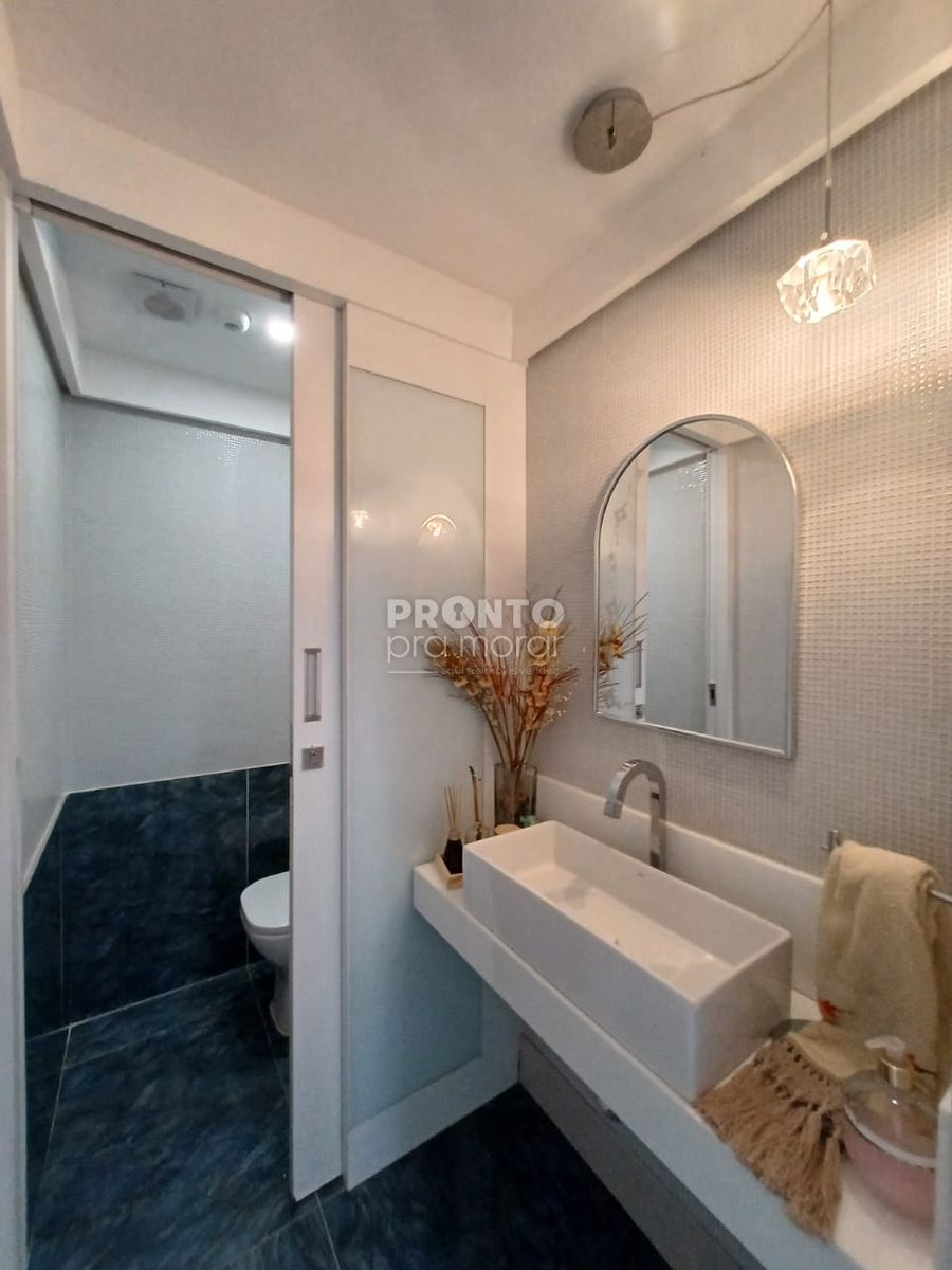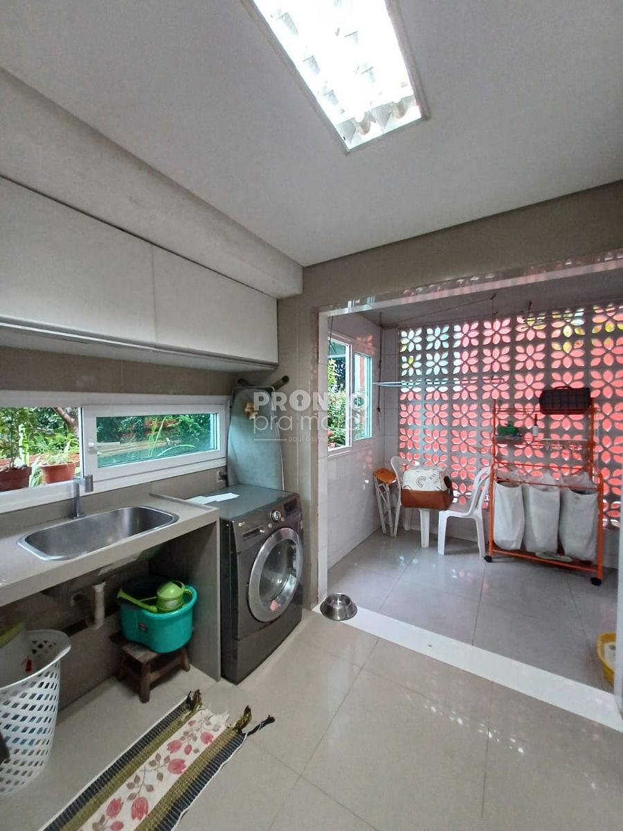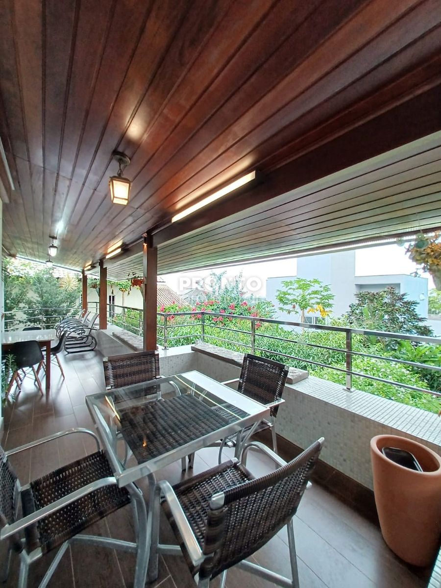 Pavimento inferior: O imóvel possui um terraço amplo, sala para quatro ambientes, cozinha, área de serviço, lavabo, dois quartos sendo um suíte, três vagas de garagem, elevador, banheiro social, quarto de depósito e uma área ampla com jardim e espaço goutmet.