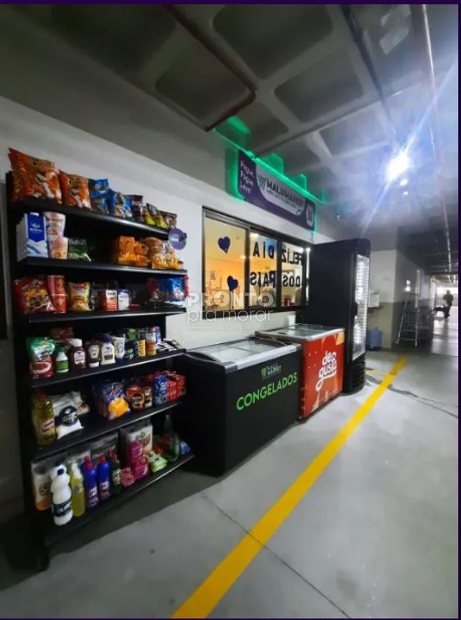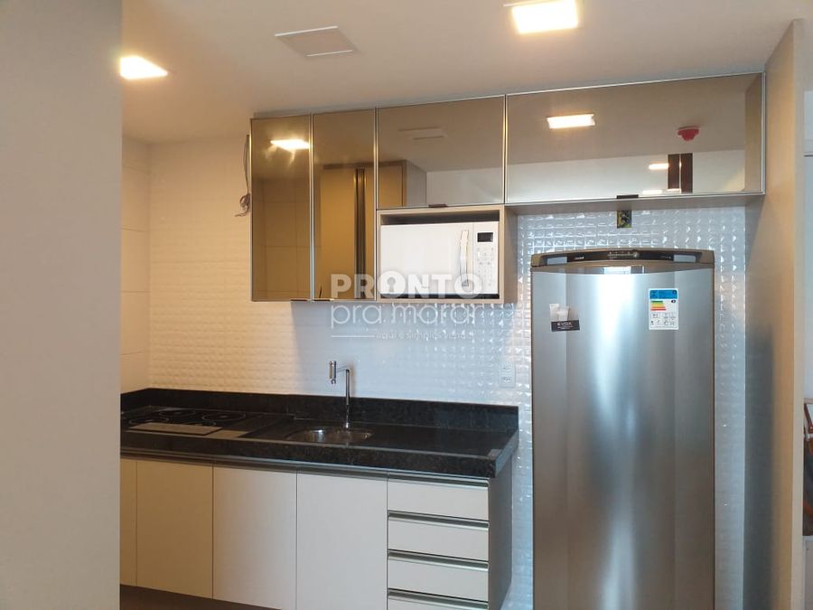O imóvel conta com sala para 2 ambientes, suíte, cozinha equipada, área de serviço e banheiro social.